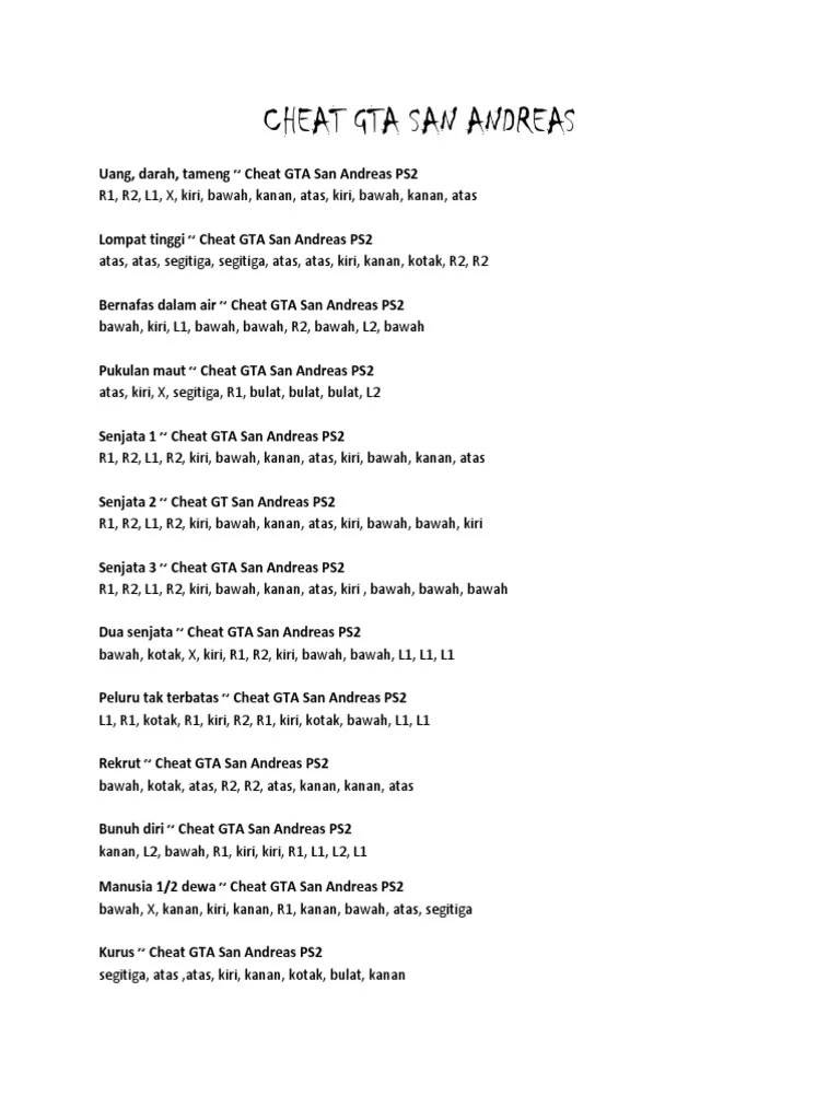 Kode curang gta liberty city stories psp & ps2. Muhammad hafid ali 7/28/2014 cheat games ps2 cheats · muhammad hafid ali. Klik daftar isi berikut untuk akses . Cheat grand theft auto san andreas ps2 pengikut. Darah tak terbatas bawah, x, kanan, kiri,.
